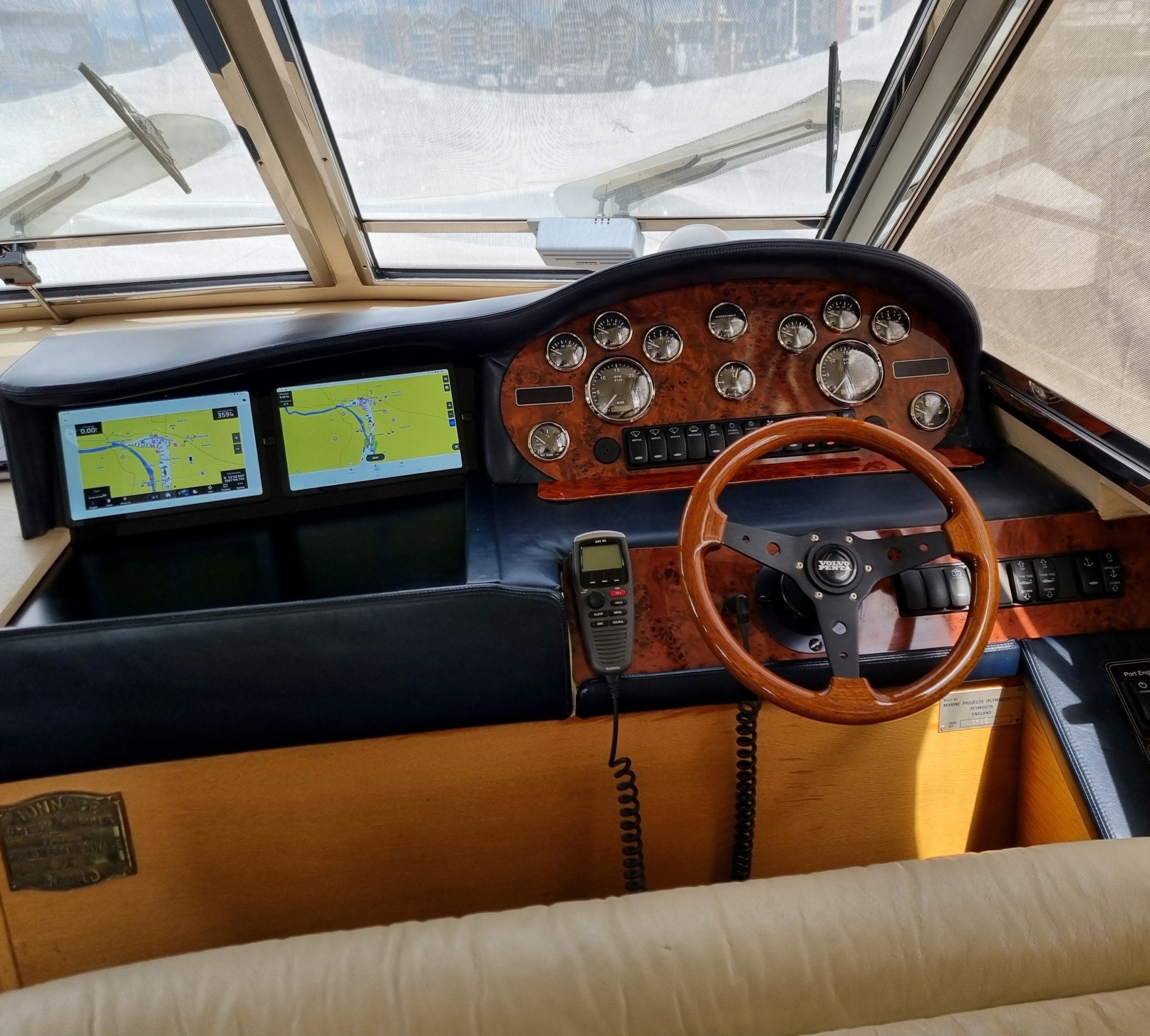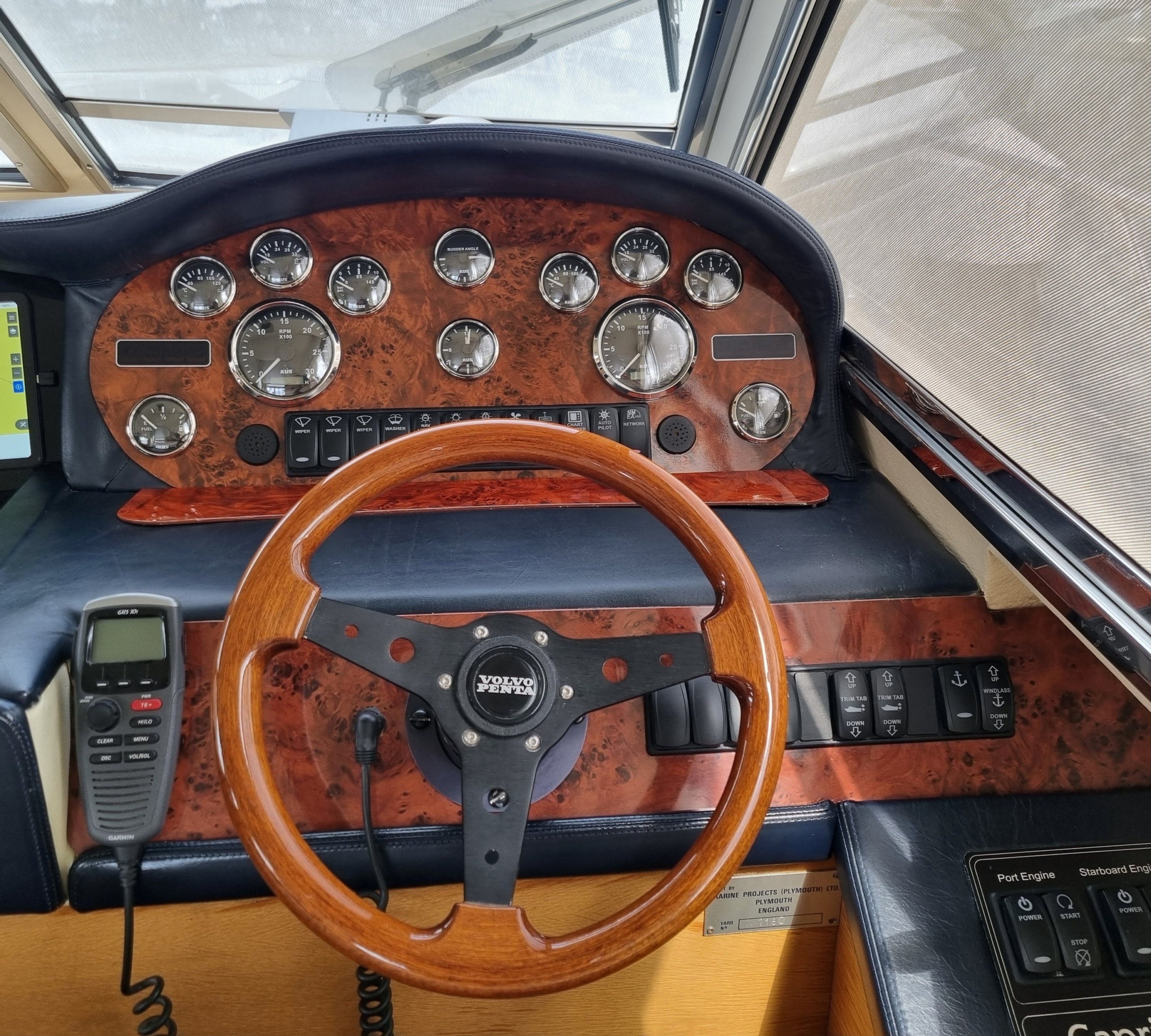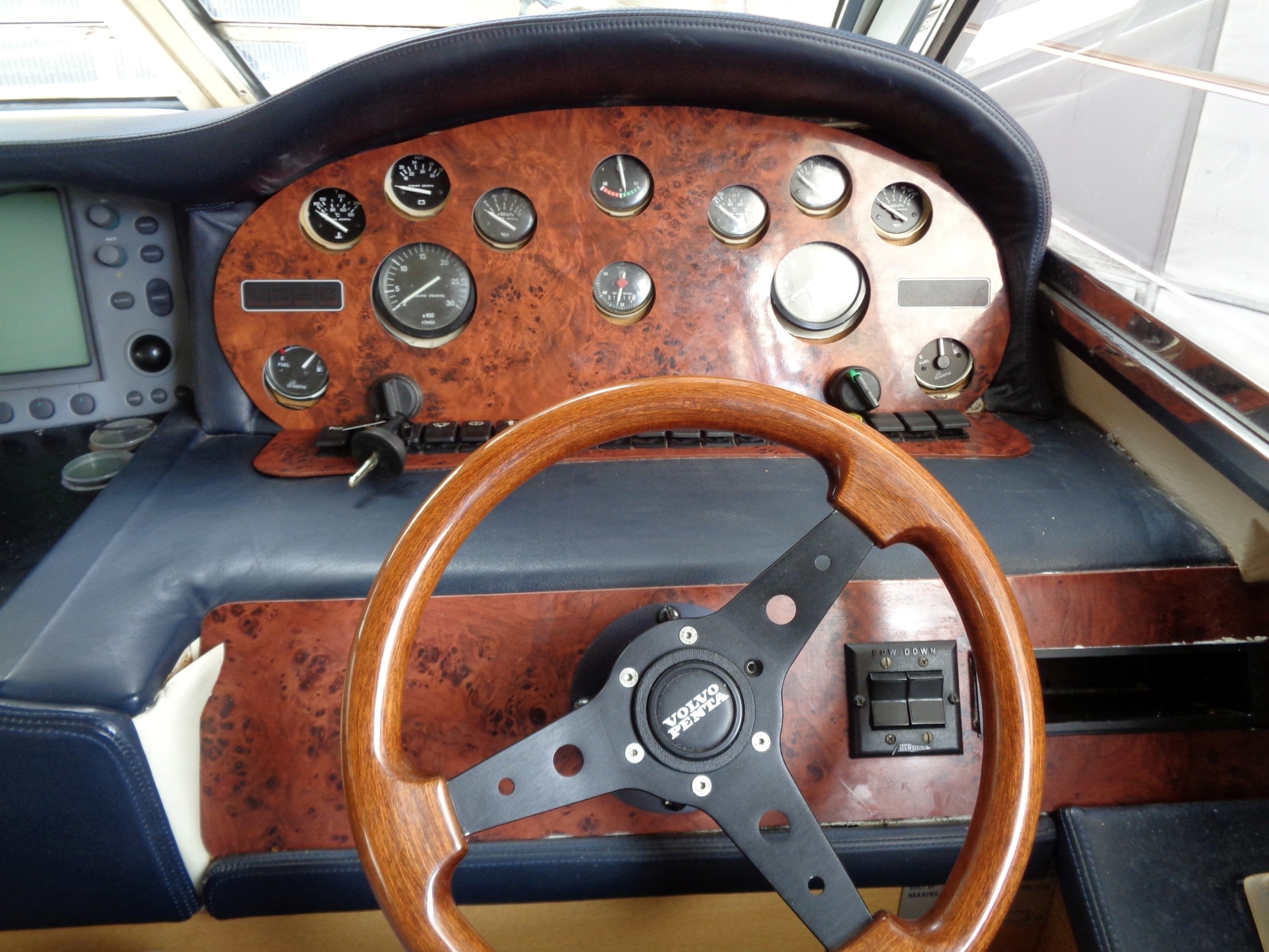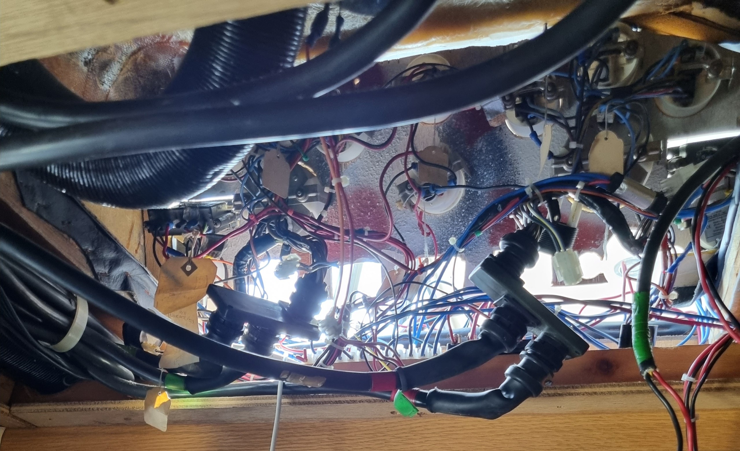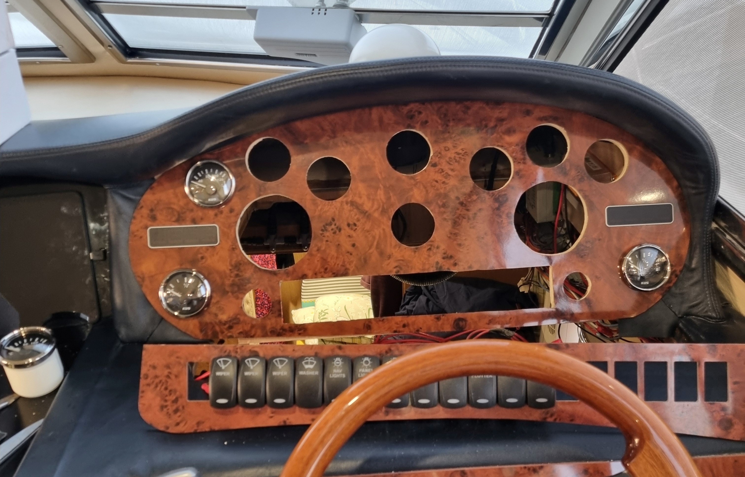 Although someone had fitted a more modern helm, the radar and plotter were ancient and they had made a very poor job of fitting the engine gauges. The walnut effect panel was not actually fixed in place, it just hung on the gauges, frequently falling down.