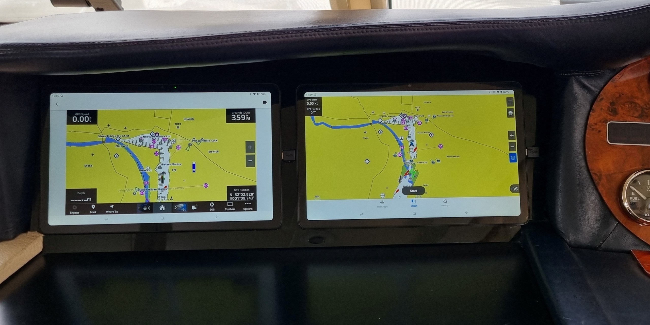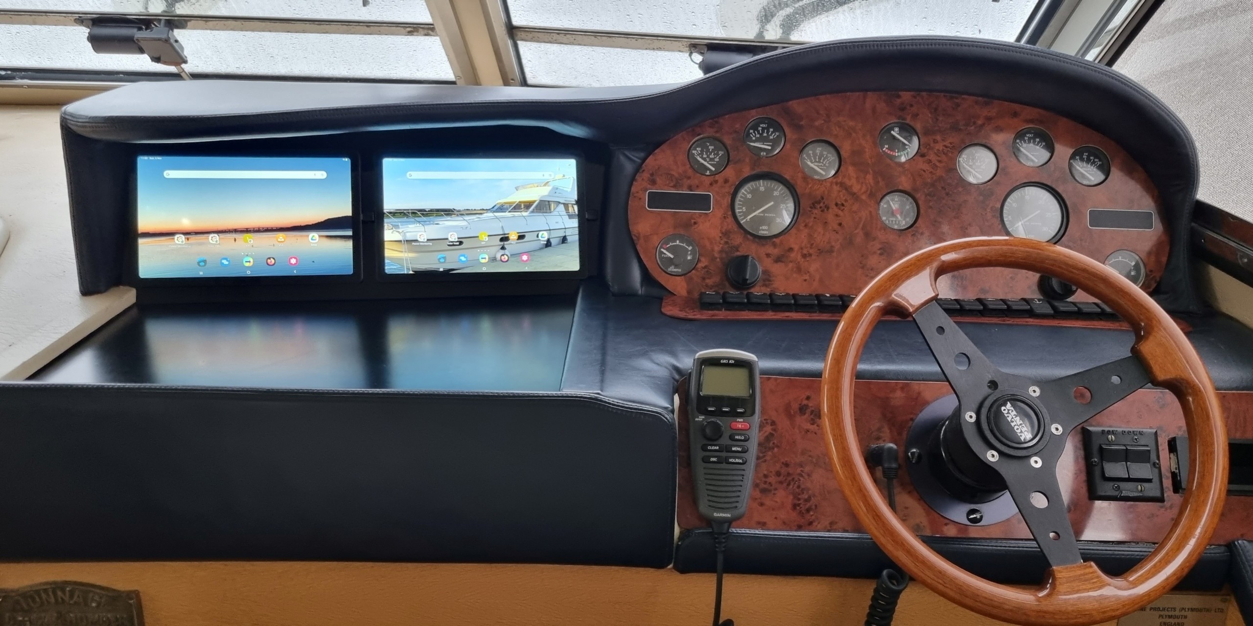 Both tablets fitted, with a thin strip of Perspex below the tablets for extra support. Either can be used as a stand alone plotter, a mirror of one of the flybridge MFD’s, a monitor for the Victron systems or anything else a tablet can do.