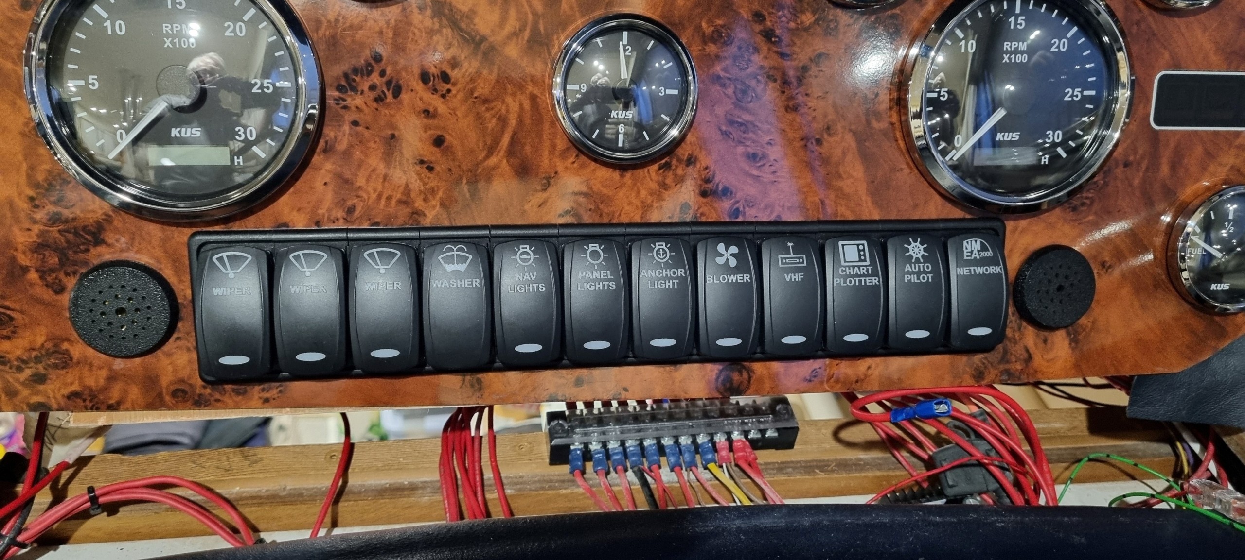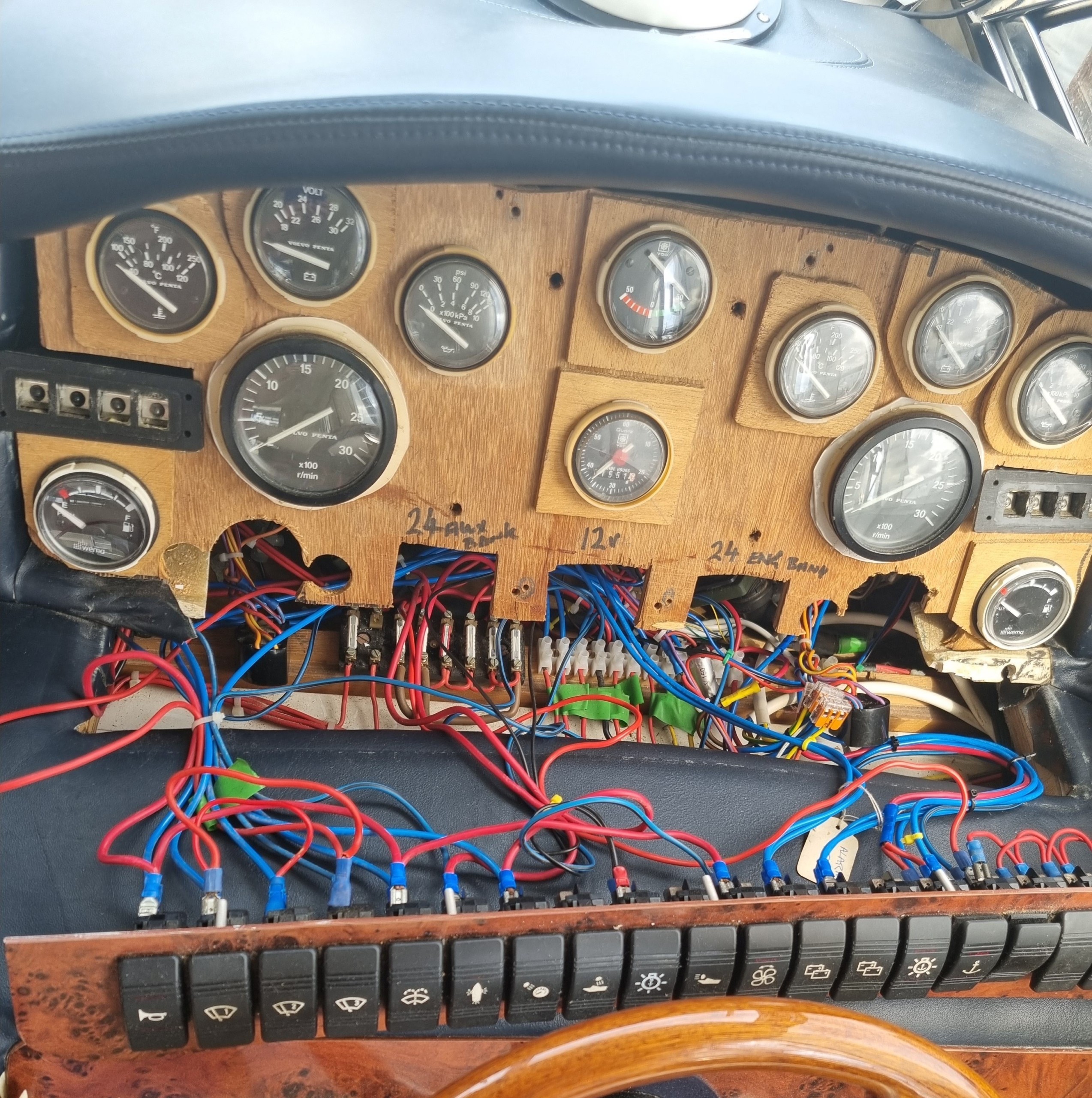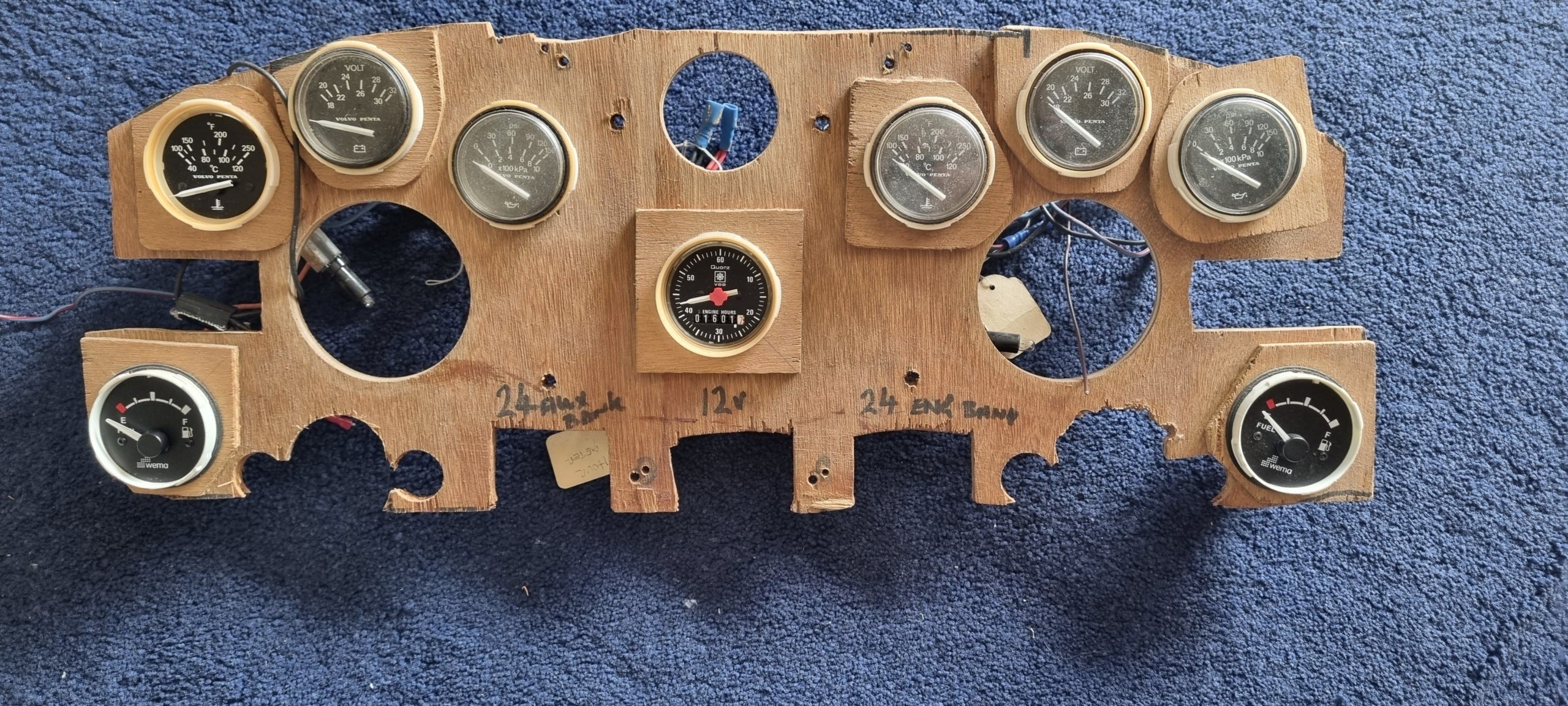 The wiring and gauges were removed, a new ply panel was fitted and the new gauges were installed . New switches were installed and wired up.